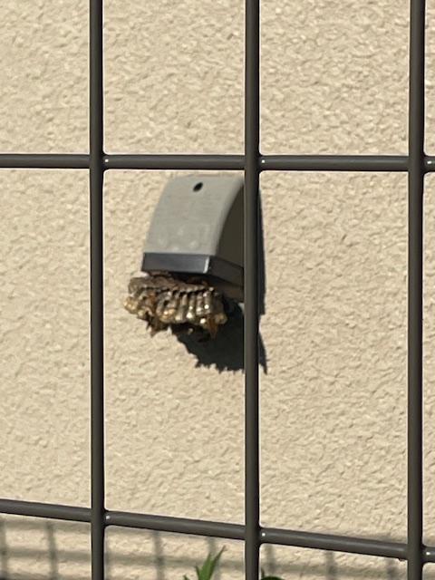 2階の換気口の中に、アシナガバチが巣を作っているとのことで、お隣との兼ね合いもあり、最短で駆除して欲しいとのことでした😅